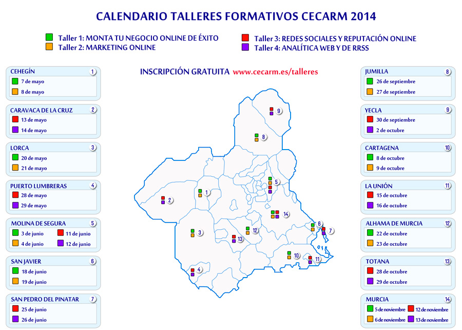 | 20 y 21 de mayo | T1 y T2 | Lorca | 9:30 a 13:30 h. | Centro de Desarrollo Local, Alameda de Cervantes, 30. | Mapa |